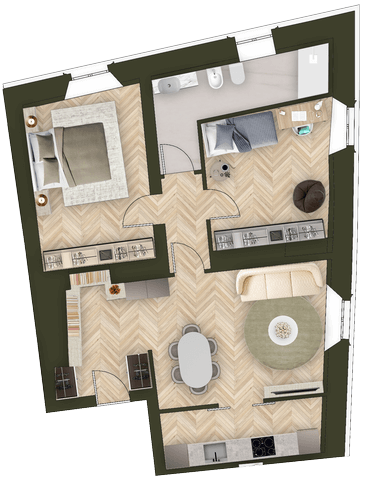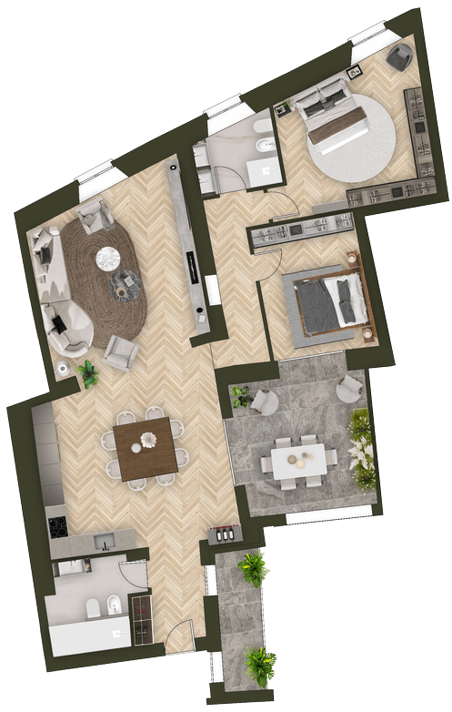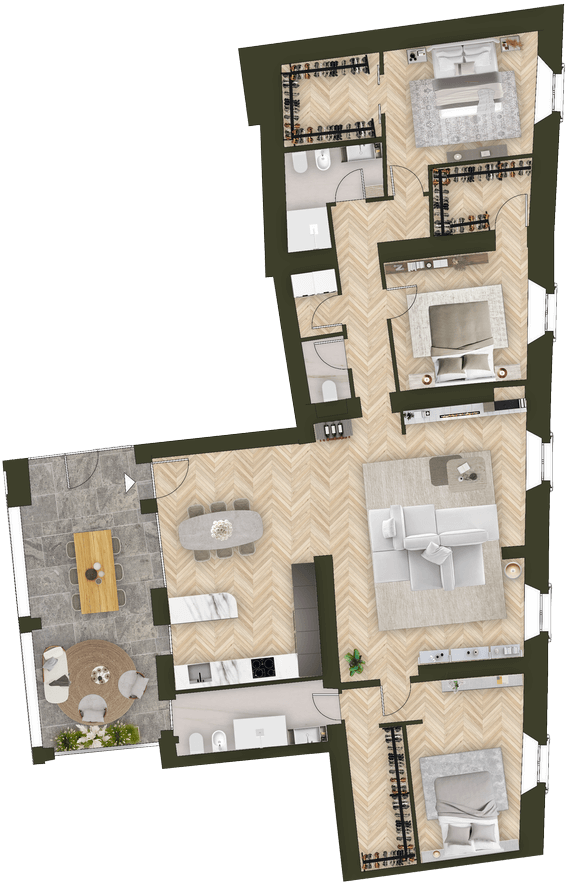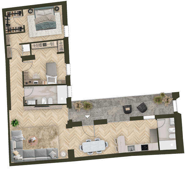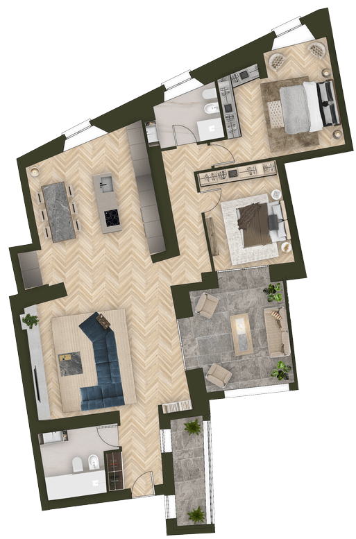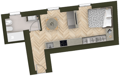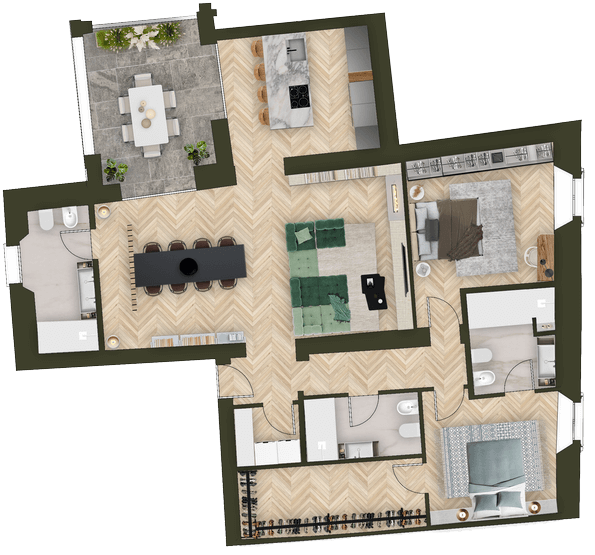 I contenuti grafici quali render e virtual tour potrebbero non coincidere con l'esatta conformazione della singola unità.