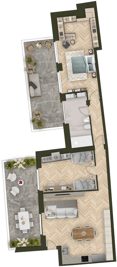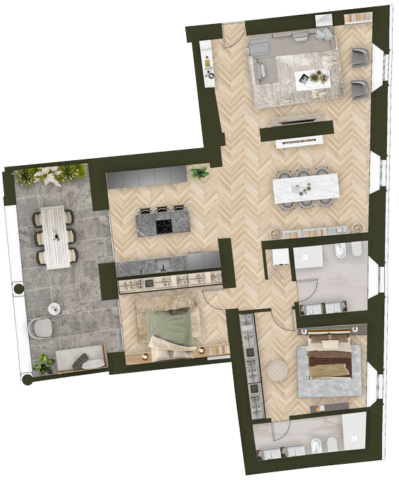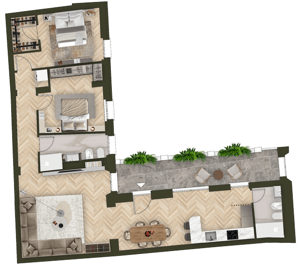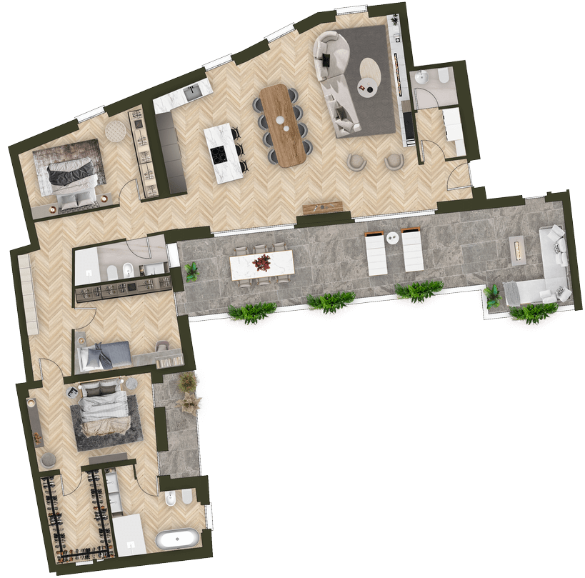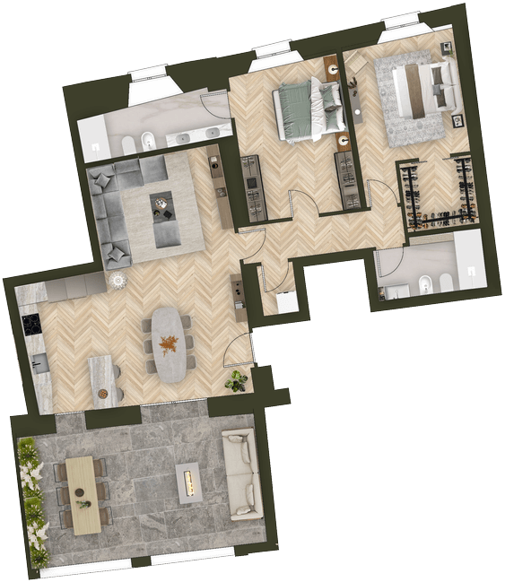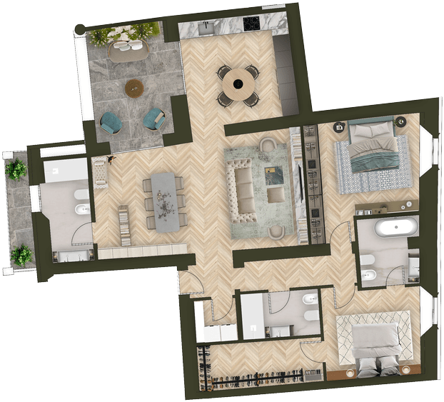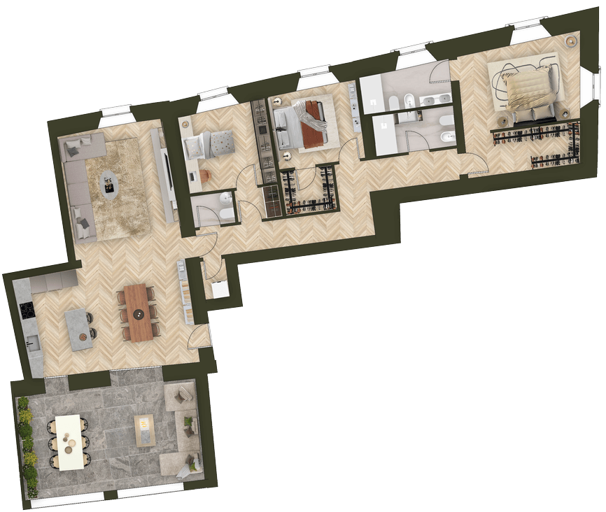 Le finiture interne potranno essere scelte all’interno del prestigioso Capitolato Barocco, con ampia possibilità di personalizzazione per rispondere ai gusti più raffinati. A completare l’offerta, uno studio di interior design è in fase di sviluppo per proporre soluzioni d’arredo su misura.